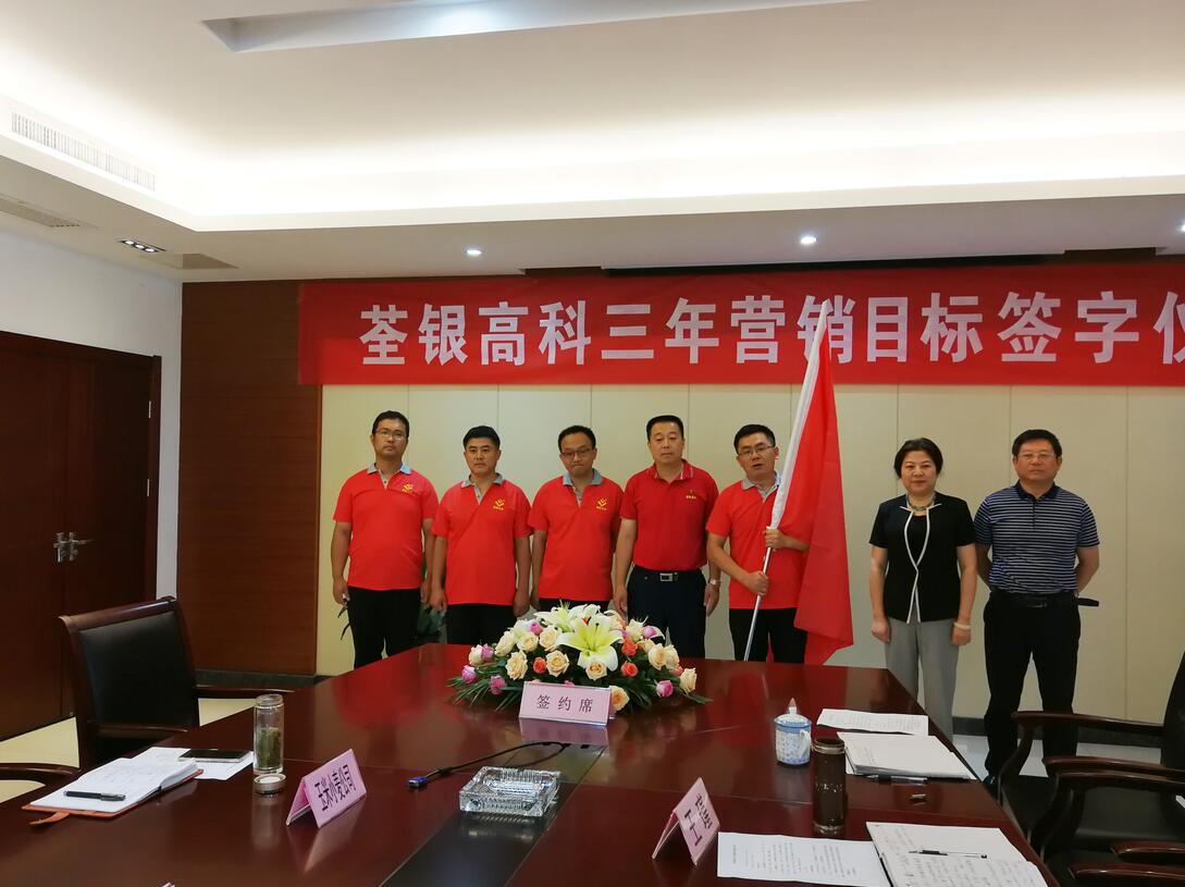 ????2018年7月11日上午,荃銀高科舉行三年營銷目標簽字暨授旗儀式,公司全體經營班子成員,總部各營銷公司、專業公司負責人及其團隊參加了此次簽字儀式。通過開展此次活動,有利于提高公司營銷能力,充分調動營銷人員積極性和主動性,實現責權利充分掛鉤,以適應當前新階段新形勢新任務,努力完成公司經營目標任務。